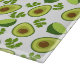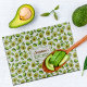 This custom cutting board features avocados pattern with a label.