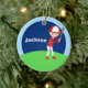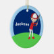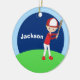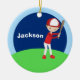 Cooles individuelles Baseball-Ornament für ein Kind, das Little League oder T Ball spielt. Dieses niedliche Weihnachtsgeschenk zeigt ein Kind, das eine rote Baseballuniform trägt und eine Fledermaus auf einem grünen Feld vor blauem Hintergrund hält. Personalisieren Sie diese, indem Sie einen weißen Namen am blauen Himmel hinzufügen.