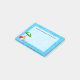 Custom Post-it-Notizen mit Retrobriefen und lustige Strand- oder Schwimmbecken themed Kunst eines roten Beachball, grüner Sonnenschirm, Feriensandalen und Sonnenöl auf einem wasserblauen Hintergrund.