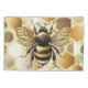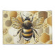 Eine künstlerische Darstellung einer Biene, die auf einer Wabendecke ruht, umgeben von Hexagonen und Kreisen, mit schwarzen, gelben und goldenen Farbtönen auf weißem, schwarz-weiß gestreiften Hintergrund.
