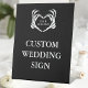 Benutzerdefiniertes schwarzes Tischschild für eine schwarze Skelettverheiratung "bis zum Tod machen wir Teil". Personalisieren Sie das Innere des Herzens mit den Initialen der Braut und des Bräutigams, dem Hochzeitstag oder einer beliebigen persönlichen Nachricht, die Sie Ihren Gästen am Empfang, bei der Zeremonie oder im Party hinzufügen möchten.