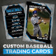 Zeigen Sie Ihre Liebe für das Spiel mit dieser stilvollen und anpassbaren Baseball Trading Card. Mit einem kühlen, modernen Design und einem eleganten Schwarz/Blau-Farbschema ist diese Karte ideal, um Ihren Lieblingsspieler zu ehren. Fügen Sie einfach Ihr eigenes Foto, Spielername, Teamname und Statistik für eine personalisierte Touch hinzu.