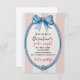 "Celebrate friendship in style with this charming Galentine’s Girls’ Night invitation! Featuring a hand-painted blue bow and scalloped oval frame on a soft cream background with festive beige stripes, this design is elegant, fun, and perfect for a stylish night out with your favorite girls. The classic color palette gives it a playful yet classy look, making it ideal for brunches, cocktail nights, or a glamorous girls’ celebration. The open center provides plenty of space to personalize your party details. Perfect for Galentine’s Day, Valentine’s-themed gatherings, or any girls-only celebration. Easily customize text, dates, and details to make it uniquely yours."