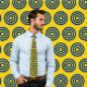 Eine coole Krawatte mit einem sich wiederholenden Muster schwarzer konzentrischer Kreise auf goldenem Hintergrund. Eine tolle Wahl zum Punk oder Rock n' Roll Outfit.