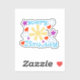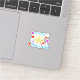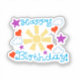 A Tiny 2”x2” Sheet,Media=Glossy White, Custom Cut Vinyl Sticker, With a Happy Birthday ! Drawing, Design,= ( of the Sun and Clouds, and Hearts and Stars ),on it. = (Drawing, Design by P.J.M.)
