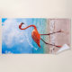 Freuen Sie sich auf Komfort am Strand oder am Pool und lassen Sie sich von diesem farbenfrohen Strandtuch cool und abkühlen. Lassen Sie sich im Sand von diesem schönen, zeitgenössischen Aquarellbild mit rosa Flamingo, das an einem tropischen Strand parkt, mit blauen und türkisfarbenen Ozeanen, Surfen im Hintergrund und einem hellen Sommerhimmel. Mit der Option, um personalisieren oder mit Namen oder Text Ihrer Wahl. Verziertes, skurriles und trendiges Design mit einer Vielfalt an unterhaltsamen, eleganten und trendigen Dekorationsakzenten und Strandelementen.