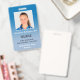 Behalte Ihr Krankenhaus- oder Praxissafe mit individuellen Foto-ID-Abzeichen mit Foto, Name, Berufsbezeichnung und Personalausweis sowie dem Firmennamen. Sie können auch eine Abteilung, wenn Sie möchten. Ideal für eine Krankenschwester oder andere Mitarbeiter. Auf der Rückseite können Sie weitere Informationen hinzufügen, wie z.B., wo das Abzeichen zurückgegeben wird, wenn es verloren geht. Passen Sie es mit einem Foto und benutzerdefinierten Text in der Seitenleiste an. Das quadratische Foto hat einen dünnen weißen Rand auf einem blauen bis hellblauen Farbverlauf. Der Jobtitel, die ID-Nummer und das Ablaufdatum befinden sich im navy-blue Sans Serif Text. Der Name des Mitarbeiters sowie der Krankenhaus- oder Geschäftstext sind in einem weißen Schriftart für Kontrast.