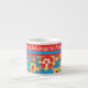 Eine Espresso Coffee Tasse, die sich durch ein fröhliches, rundum gelbes, rot, orange und gelbes Blumenmuster auf einem hellen türkisfarbenen Hintergrund auszeichnet, das von Judy Adamson in einer handbemalten Papiertüte entworfen wurde.