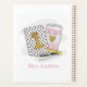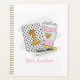 This first grade teacher personalized planner will keep lesson plans in one place. Pattern has white with black polka dot notebook with a gold one, heart coffee, ruler, pen and pencil. This white with black polka dot notebook design can be found on other items in my shop, PageCreativeDesigns.