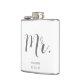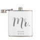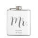 Ein modernes personalisiertes, weißes Drehbuch, das den Namen Mr. Groom verheiratet, datiert Flasche. Personalisieren Sie dies für eine Hochzeitsfeier Geschenk-Sake, und oder eine Verlobung Geschenk.