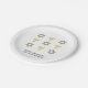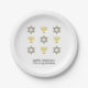 Elegante HAPPY HANUKKAH Papier Teller mit den Imitaten Gold und Silber STAR OF DAVID und MENORAH in einem gefliesten Muster vor einem schlichten, weißen Hintergrund. Text liest HAPPY HANUKKAH mit einem Platzhalter und ist KUNSTBAR, sodass Sie ihn PERSONALISIEREN können, indem Sie Ihren Namen oder einen anderen Text hinzufügen. Ideal für hanukkah Feiern, und mit der Anpassung kann für jedes jüdische Event geeignet sein. Wählen Sie aus einer großen Auswahl an Hanukkah-Party-Artikeln von Berean Designs.
