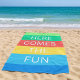 Helles Strandhandtuch in hellen Farben mit Jade- und Limettengrün, Korallenrot, lebendiges Sonnengelb, Himmel und Azurblau Streifen Muster, und Spaß HIER KOMMT DER SUN Zitat. Feiern Sie die Sommerzeit... Strandzeit, Poolzeit, Spaß!