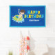 Phantastisches Kinderschwimmbad Happy Birthday Party Banner für ein brünettes Kind im Schwimmteam im Sommer. Ein heller, lustiger Pop mit Farbtupfern und ein cooler Schwimmjunge in einem Schlauch. Für ein besonderes Kindergeschenk.