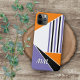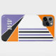 Moderne, hellorangefarbene, lila, schwarze und weiße geometrische Streifen, Linien und Dreiecksformen mosaikfarbene Muster. Mit Raum zum Anpassen oder Personalisieren mit einem Monogramm oder Initialen Ihrer Wahl. Schönes, modernes und cooles Cover für den Trend-geschickten und kunstliebenden angesagten Trendsetter, künstlerischer Motif-Liebhaber, der will, ihr Handy vor Staub und Schmutz, Abnutzung und Tränen zu schützen. Dieses Design ist erhältlich in Apple iPhone 6, 7, 8, 10 oder X, XR, XS, 11, 12, 13 Mini, 14, 15 Plus, und Pro Max Handy Hüllen. Zeigen Sie Ihren Stil, sehen Sie in der Mode und fühlen Sie sich stilvoll mit einem einzigartigen Design auf einem mobilen Zubehör Ihrer Wahl.