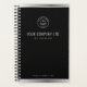 This custom planner cover boasts a sophisticated design with a sleek black background, elegantly framed by polished silver borders. Your personalized logo and company information are prominently displayed in a modern silver tone at the top, while your website address is subtly featured within a silver band at the bottom. This refined aesthetic offers a professional and minimalist look, perfect for a chic brand statement.