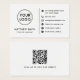 Weiße oder benutzerdefinierte Farbe, modernes, elegantes und berufliches Design von Visitenkarten mit Vorlagenfeldern für Name, Firmenname/Firmentitel, Logo (Foto oder andere Grafik) und Kontaktinformationen einschließlich Social Media Icons und Website URL. Fügen Sie dem Hintergrund Ihren eigenen QR-Code hinzu. Ändern Sie die Hintergrundfarbe, verschieben und verändern Sie Elemente mit dem Anpassungstool.