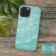 Zeitgenössisches weißes Mandala-Rosette-Muster auf einem hellblaugrünen, aquamarinen Hintergrund. Mit Raum zu personalisieren oder mit einem Namen, Monogramm Initial, oder Zen Wort Ihrer Wahl. Schönes, modernes und cooles Cover für den Trend-geschickten und kunstliebenden angesagten Trendsetter, künstlerischer Motif-Liebhaber, der will, ihr Handy vor Staub und Schmutz, Abnutzung und Tränen zu schützen. Dieses Design ist erhältlich in Apple iPhone 6, 7 und 8 Plus, 10 oder X, XR, XS, 11, 12, 13 Mini, 14, 15 Plus, und Pro Max Handy Hüllen. Zeigen Sie Ihren Stil, sehen Sie in der Mode und fühlen Sie sich stilvoll mit einem einzigartigen Design auf einem mobilen Zubehör Ihrer Wahl.
