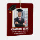 Dieses maßgeschneiderte Maroon Rot Senior Graduate Weihnachtsschmuck zeigt Ihr Abschluss Foto unter einem schwarzen Graduierdeckel. Personalisieren Sie Ihre Unterrichtszeit, Schule und nennen Sie ein tolles Geschenk für einen geschlossen Schüler.