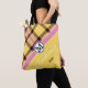 Custom Monogram Script Name Chic Tartan Bridesmaid Tote Bag Moderne, elegante und stilvolle anpassbare Tasche mit rosa / gelb kariertem tartan Hintergrund, "personalisierte Monogramm" auf einem Baby rosa Streifen, "bridesmaid" und "personalisierter Name" unter dem gelben Hintergrund auf der Ecke. Persönlich gestaltet sich diese Tasche als Geschenk für eine Brautjungfrau, indem Sie Ihre Monogramm, Ihren Namen oder Text hinzufügen / Schriftart, Farbe, Größe und Position ändern.
