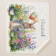 Das Design kann personalisiert werden, indem man einen Namen hinzufügt, es zu einem nachdenklichen und einzigartigen Geschenk macht oder bewahrt, das sich wirklich besonders anfühlt. Peter das Kaninchen in seiner blauen Jacke mit farbigen Ballons in seinem Blumengarten mit einem weißen Schlammzaun
