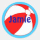 Ein roter Beachball mit einem eigenen Sprichwort in lustigen Buchstaben auf einem ozeanblauen Hintergrund.