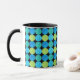 Eine schicke, schwarz-weiße Ringer-Tasse mit einem kühnen Blue Moons 'grid'-Muster in Türkis, Neon Green und Aquamarin auf einem schwarzen Hintergrund, die Sie ändern können, wenn Sie wollen - Blau oder Weiß auch gut aussehen. Teil der Posh & Painterly 'Blue Moons' Kollektion.