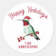 Niedlicher individualisierbarer Happy Holidays Aufkleber mit einem rubingewirbelten Kolibri mit einer Weihnachtsmannmütze auf weißem Hintergrund. Fügen Sie einfach Ihren Namen hinzu!