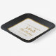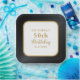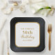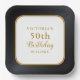 Teller aus schwarzem, weißem und goldfarbenem Vierkantpapier für eine 50. Geburtstagsfeier. Dieses Template-Design erlaubt es, sie mit dem Namen, Meilenstein und dem Datum der Geburtstagsfrau zu personalisieren.