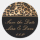 Rundaufkleber für Hochzeitsfeiern Save the Date in schwarzem Leopardendruck und Safari-Leoparden. Passen Sie diesen Aufkleber mit Ihren Namen und Datum an. Wechseln Sie zu Ihren Farben einfach auf anpassen und gehen Sie zu den Kästchen mit der rechten Maustaste auf das richtige Feld und verwenden Sie die Farbe Box.