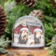 Cute and funny horses in the snow with red barns Christmas holiday country snow globe.