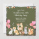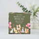 Cute animals with balloons, flowers, and birthday garlands on a green background. The balloons are pink in the shape of a heart