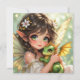 Anime fairy themed blank card. An adorable anime fairy holding her chibi baby dragon. Cute fairy with big green eyes and white flowers in her hair.