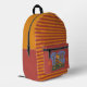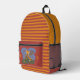 A cute backpack for kids with a cartoon fox and a fall color stripe pattern . Personalize it with the child's initials . Look in our collection for addition bag option or for a matching lunchbox .
