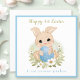 Le lapin de Pâques le plus mignon avec un oeuf de Pâques bleu 1ère carte de Pâques pour un bébé garçon. Personnalisez facilement cette carte de Pâques avec votre propre texte. - Kate Eden Art.