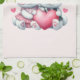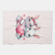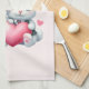 A kitchen towel with an illustration featuring 2 white furry bunnies sharing a big PINK heart. The girl bunny is wearing a cute bow on her head and heart-shaped glasses. The boy bunny is wearing an adorable little suit with a tie.
