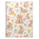 Cute Bunny Floral Spring Pattern notebook. This design features a delightful pattern of baby bunnies and colorful spring flowers. Adorable bunnies in various playful poses, some cuddling, some holding flowers, create a heartwarming and whimsical scene. The soft pastel palette of pinks, yellows, blues, and greens on a light background evokes a gentle springtime feel.