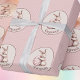 This Easter theme wrapping paper features a repeat pattern of a cute baby bunny hugging a mauvy pink easter egg with cream colored polka dots. The bunny and name are encircled in brown and set against a mauvy pink polka dot background. This is a great design for Easter but would be cute gift wrap for other spring days.