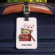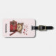 A luggage tag with a cute drawing of a little kitten poking its head out of a gift box.