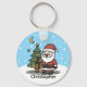 Add your name to personalize this cute Christmas Santa keychain. Spread some festive holiday cheer with this cute, cartoon Father Christmas wearing a red and white Santa hat and outfit, standing next to a green Christmas tree that is adorned with colourful lights and a yellow star. He is holding a lantern to shed some light on the snowy winter scene. below the illustration is a template to add your name to customize.