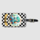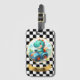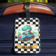 Personalized, adorable Dino Racer luggage tag as a cute dinosaur takes the wheel of a racing car, igniting excitement and fun. Perfect for little dinosaur enthusiasts and racing fans.