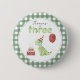 Watercolor kids birthday party. Watercolor Dino in birthday hat, cake with candles, red balloon. Green cage background.