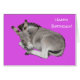 Cute little grey donkey baby foal lying down on a purple background. Texte read 'Happy Birthday!' on the front and inside 'May all your Birthday Wishes be Donkeys!' Tout texte can be change d to words of your choice.