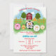The cute birthday invitation features farm animals (cow, sheep, pig, rabbit, and chicken) form into balls as they are ready to play balls.