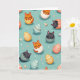 This card features a repeating pattern on a soft aqua background, filled with stylized cats peeking out from cracked decorative ovals as if they’re shyly greeting one another. Some cats are striped orange and others are charcoal gray, with closed eyes and small smiles that suggest a tender, friendly calm. Between them sit smooth, uncracked oval shapes decorated with stripes, polka dots, and tiny hearts, creating little moments that feel like quiet affection. The colors stay gentle and pastel—soft coral, muted blue, creamy white, and warm yellow—so the whole scene feels light and airy, with a subtle romantic softness in the way the faces seem to “lean” into the pattern. Small star shapes sprinkled around in white and blush pink add extra sparkle across the background, alongside a small touch of spring flair 🌷. There’s no main character or single scene; instead, the repeating layout makes it feel like an ongoing exchange of sweet glances, like friends sharing a private joke. No text appears on the front, leaving the aqua space and the pastel ovals to carry the design 🐇, and the tiny stars dot the gaps between the ovals in a scattered, even rhythm.