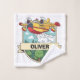 This personalized boys' wash cloth features a cute yellow and red firefighting airplane spraying water over a happy forest with cheerful trees and clouds.