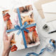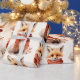 Wrapping paper with an illustration of a reddish orange fox pup. A subtle smile on his face. Wearing a nice red scarf for warmth.