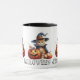 Salut ! Ajoutez le charme Whimsical à votre table de Fêtes avec cette mignonne chatte Halloween Mug! L'oeuvre présente un chat Tabby mignon portant un costume de sorcière. Son Jack-o-lanterne a un mignon petit chaton qui regarde du haut du Citrouille. Le verset dit : "Joyeux Jennifer d'Halloween !" Personnalisez cette Mug de chats en ajoutant votre nom de Chat, ou votre propre phrase !