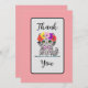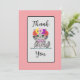 Ce carte de remerciements a un adorable chat gris et noir avec de grands yeux verts dessus. Sa tête est ornée d'une rangée de fleurs rouges, roses, jaunes et violettes. Son cou est orné d'un joli ruban rose.