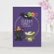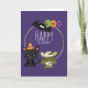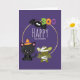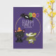 Halloween-Grußkarte mit einem schwarzen fliegenden Fledermaus, einem grünen Mummy-Fledermäusen mit weißer Bandage und einer niedlichen schwarzen Katze mit einem orangefarbenen Hexenhut. Boo schrieb in lustigen bunten Briefen.