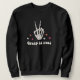 Ce drôle de design d'Halloween présente le texte Creep it Real dans une typographie rétro branchée et une main squelette donnant un signe de paix et des éclats en rose orange et blanc.